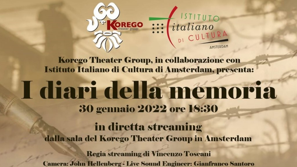 In occasione del Giorno della Memoria che viene celebrato in onore delle vittime della Shoah il Korego Theater Group, in collaborazione con l’Istituto di Cultura Italiana di Amsterdam, presenta “I diari della memoria “, che sarà trasmesso in streaming in diretta dalla sala del Korego Theater Group ad Amsterdam il giorno 30 Gennaio alle ore 18:30 sul seguente link https://youtu.be/s9ia9KE_4R8