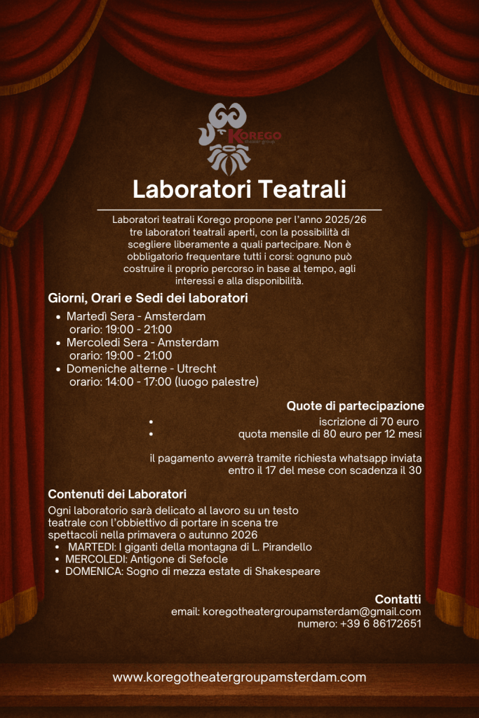 Korego propone per l’anno 2025/26 tre laboratori teatrali aperti, con la possibilità di scegliere liberamente a quali partecipare. Non è obbligatorio frequentare tutti i corsi: ognuno può costruire il proprio percorso in base al tempo, agli interessi e alla disponibilità.